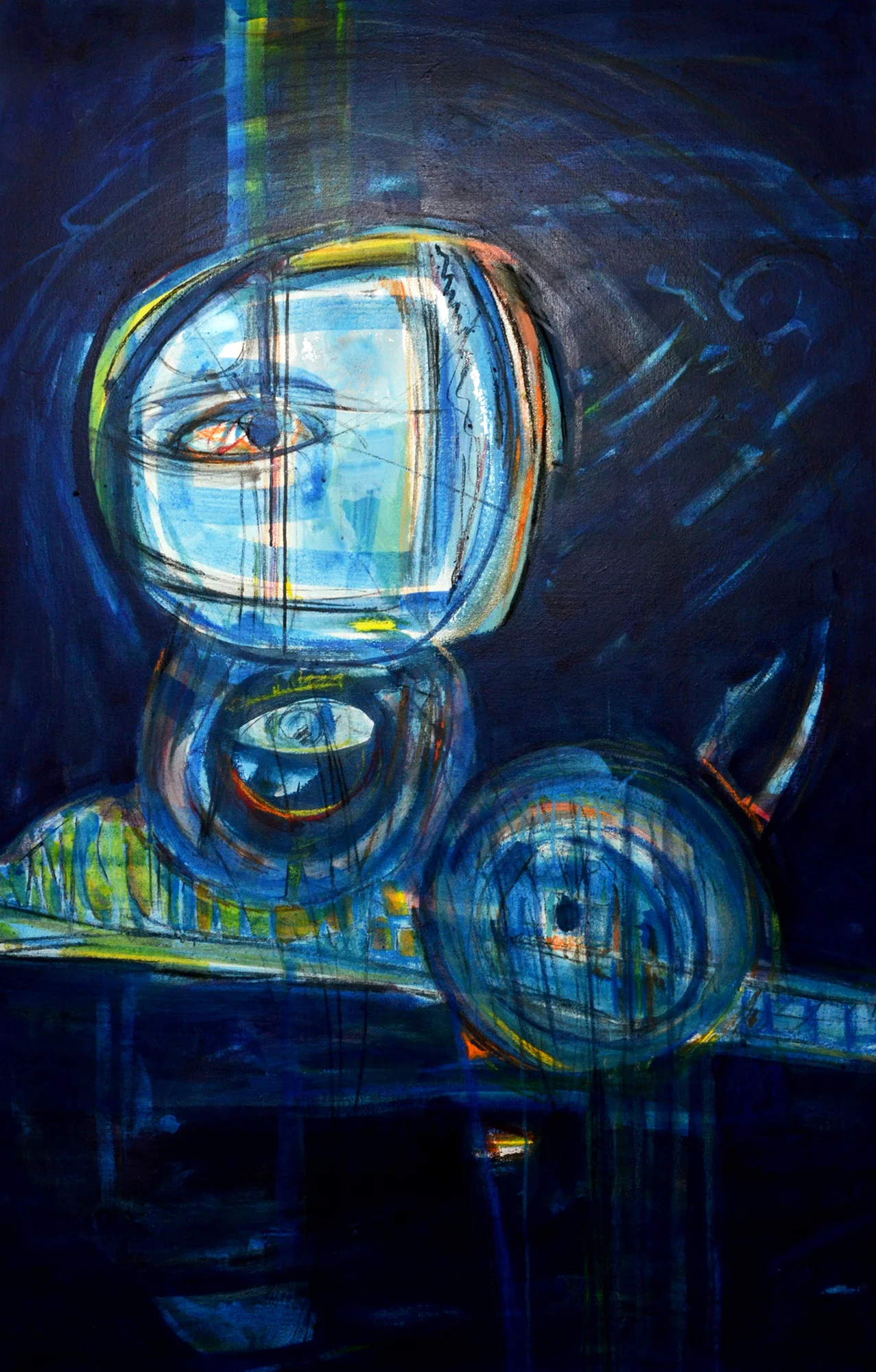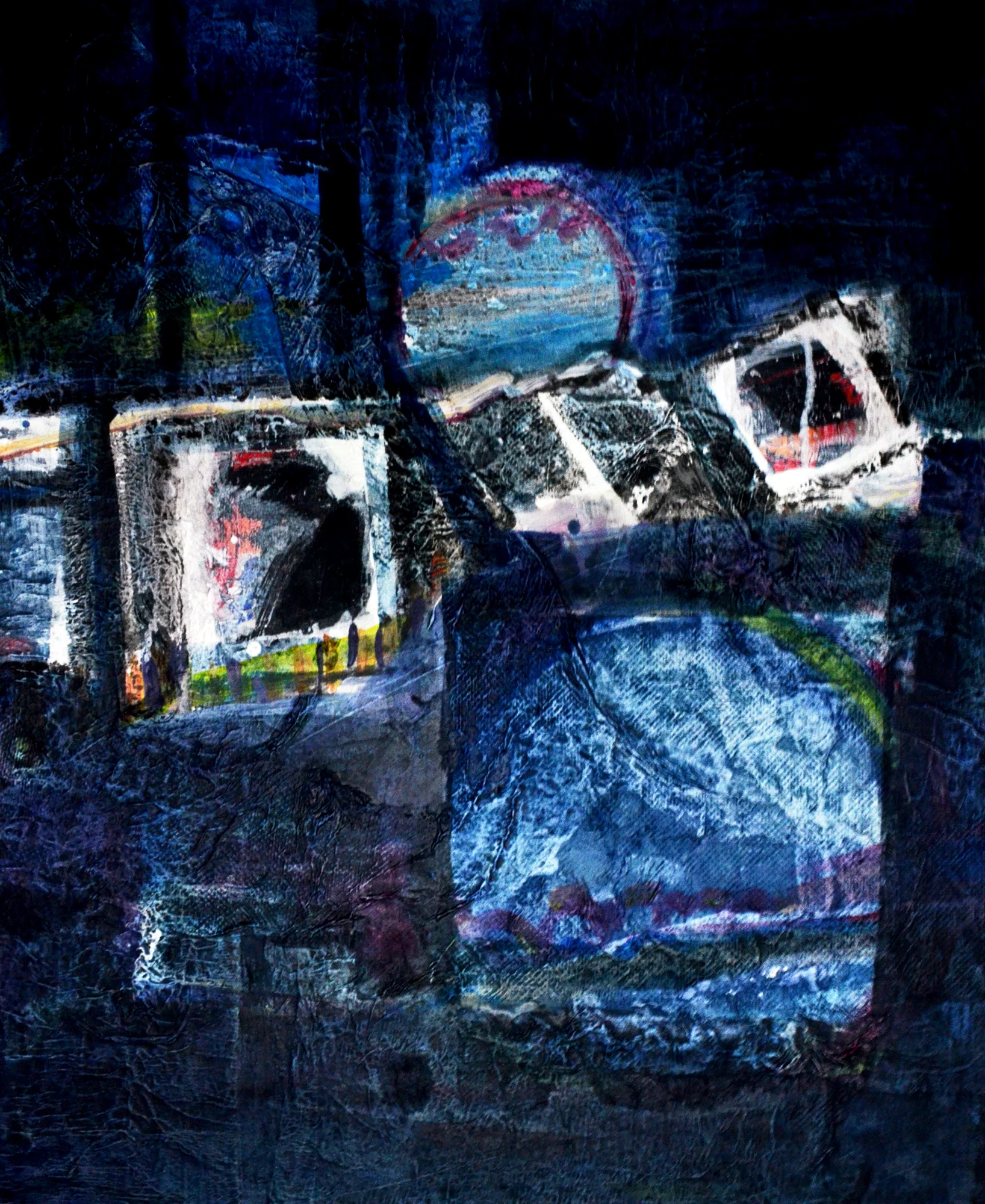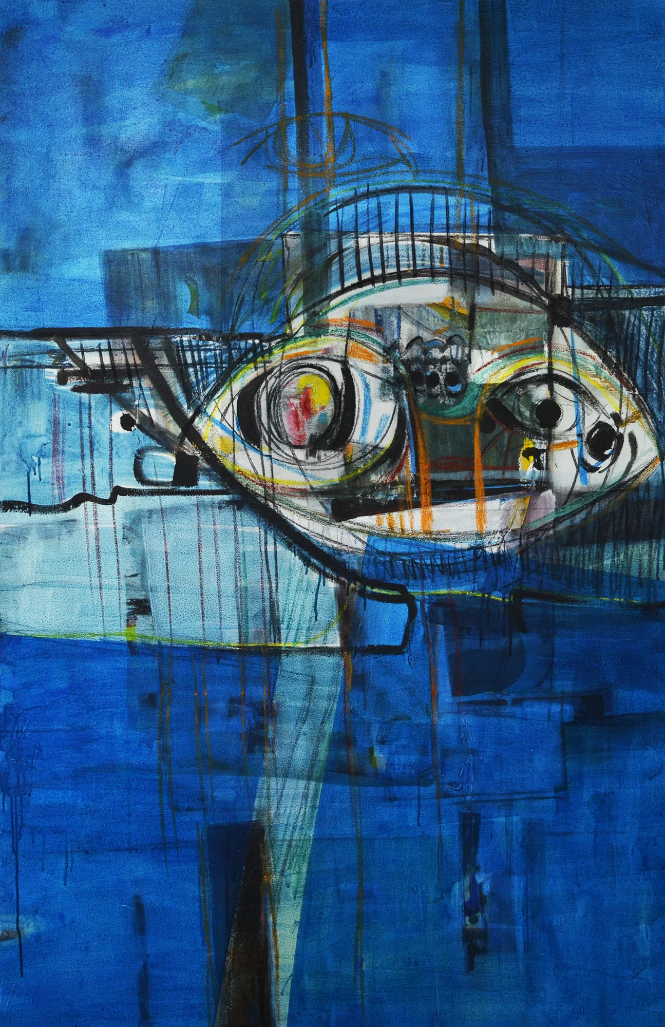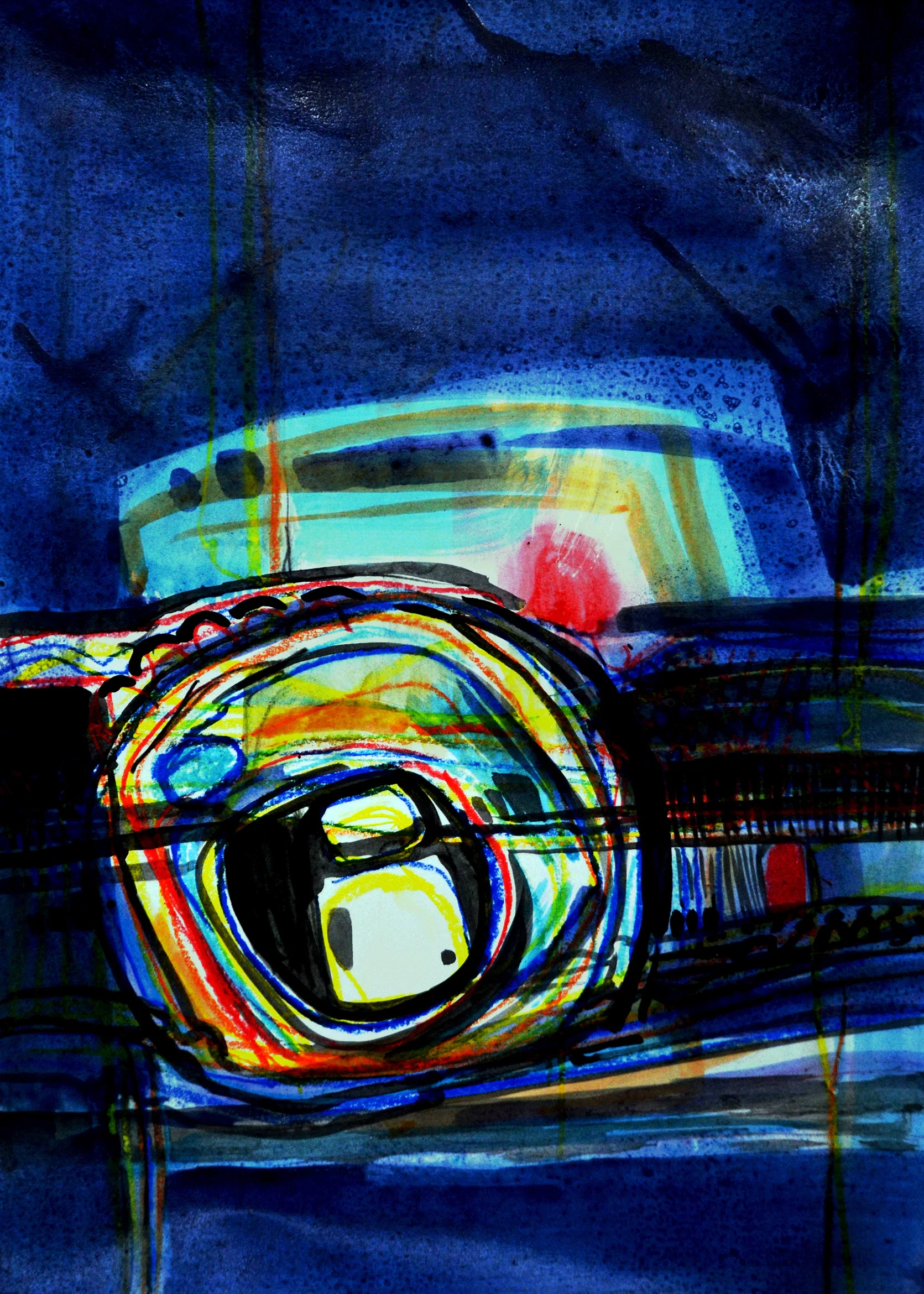 Cette série de toiles qui nous plongent dans des bleus intenses ont au départ été inspirées par les drames quotidiens des noyades par milliers de jeunes africains rêvant d’un El Dorado mensonger.